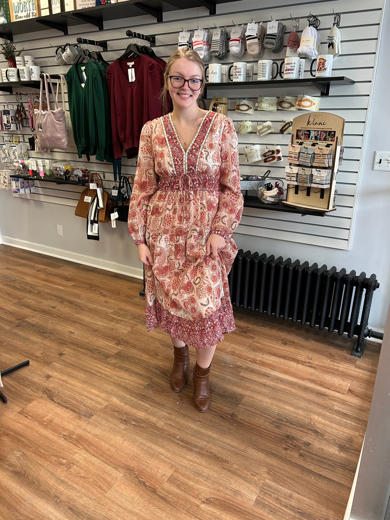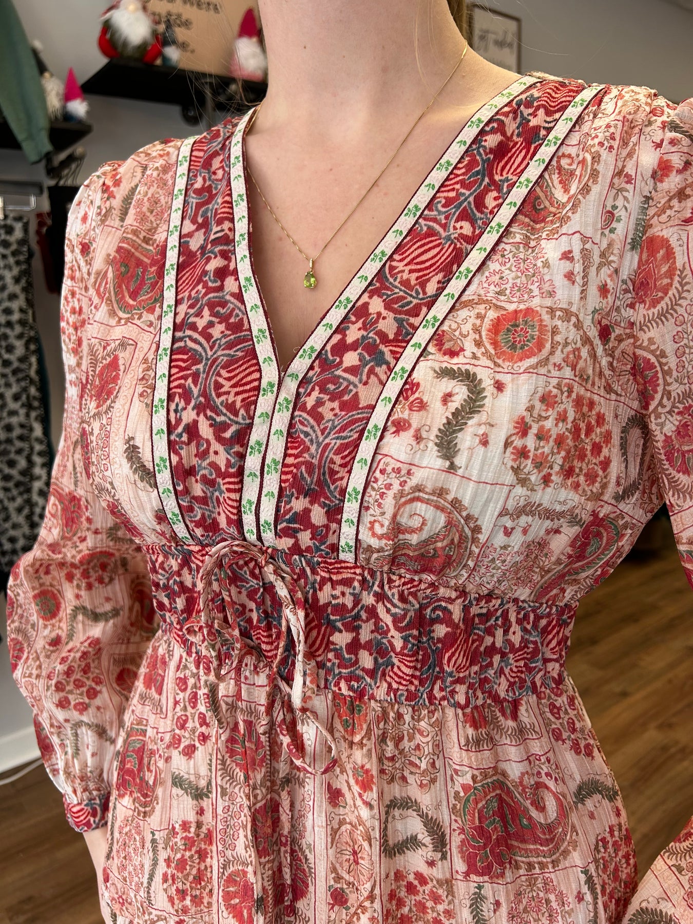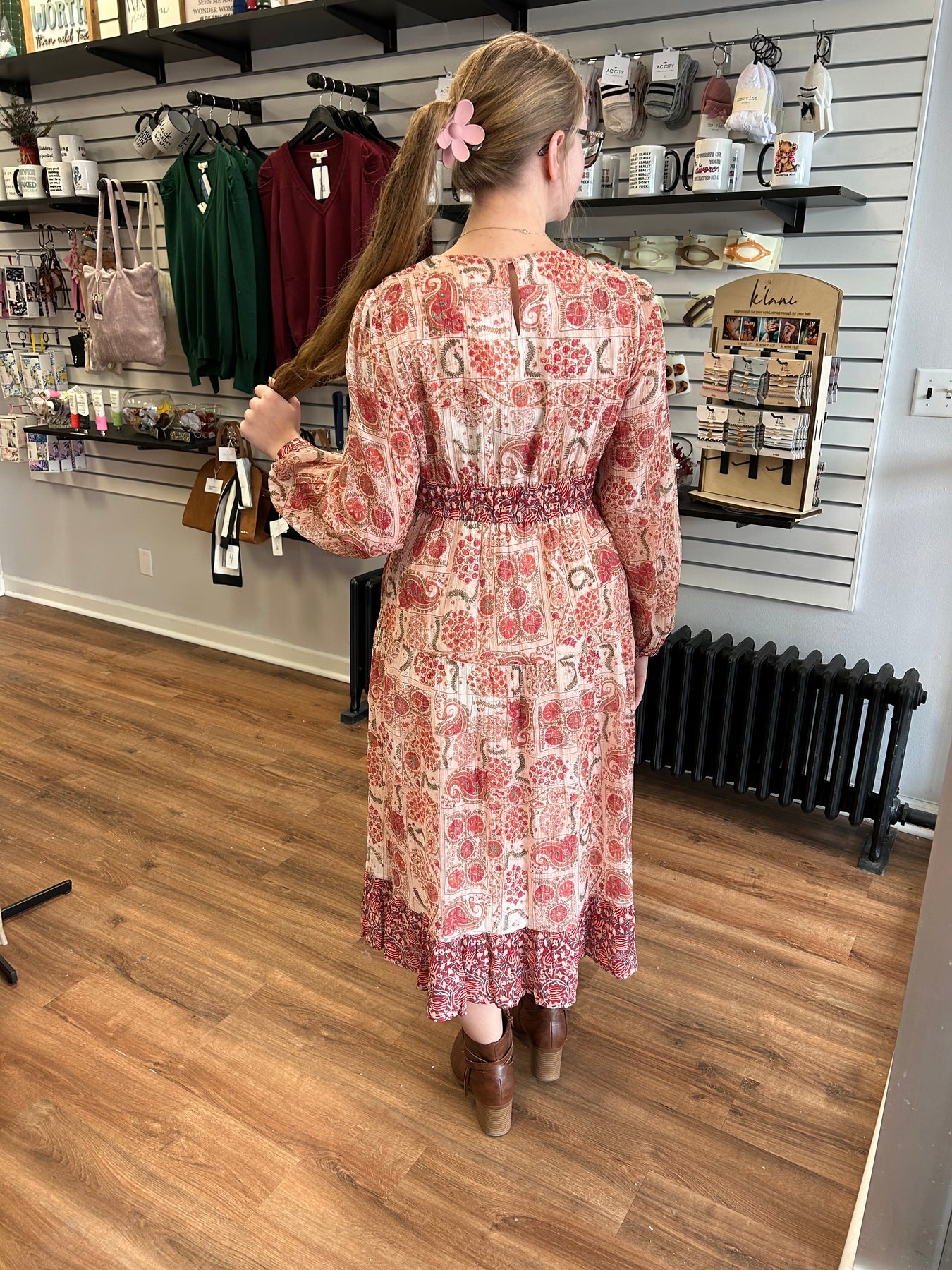 This captivating midi dress combines bohemian flair with polished refinement. Rendered in a mesmerizing mixed paisley print, it features a graceful V neckline trimmed with delicate embroidery that adds an artisanal touch. Long puff sleeves with buttoned cuffs provide vintage-inspired detail, while the shirred elastic waistband creates a sculpted silhouette. The skirt cascades into a flowing midi length, finished with a charming ruffle hem that moves with effortless elegance. An ideal choice for those seeking understated luxury with personality.