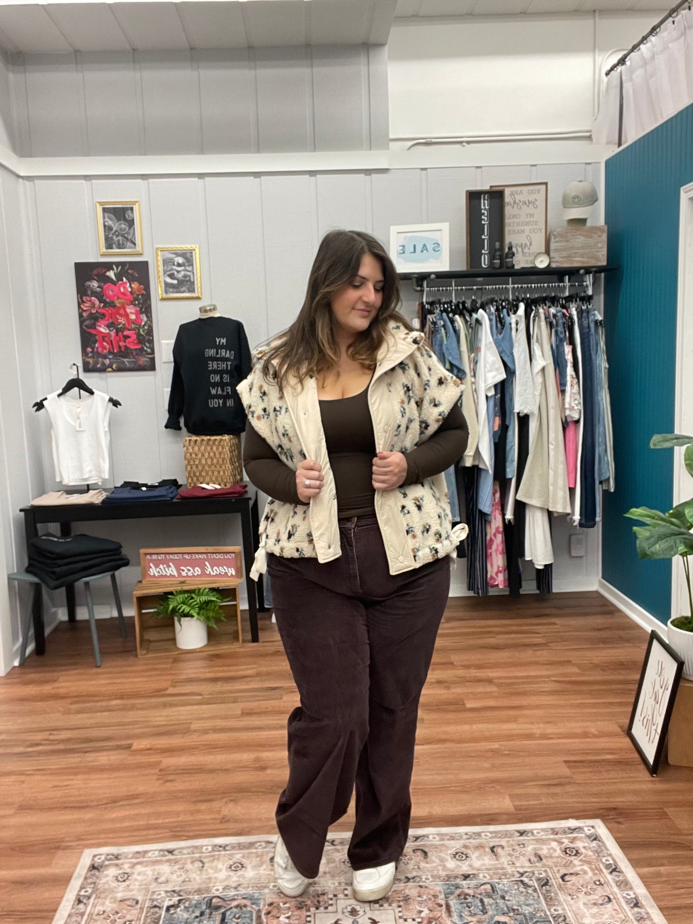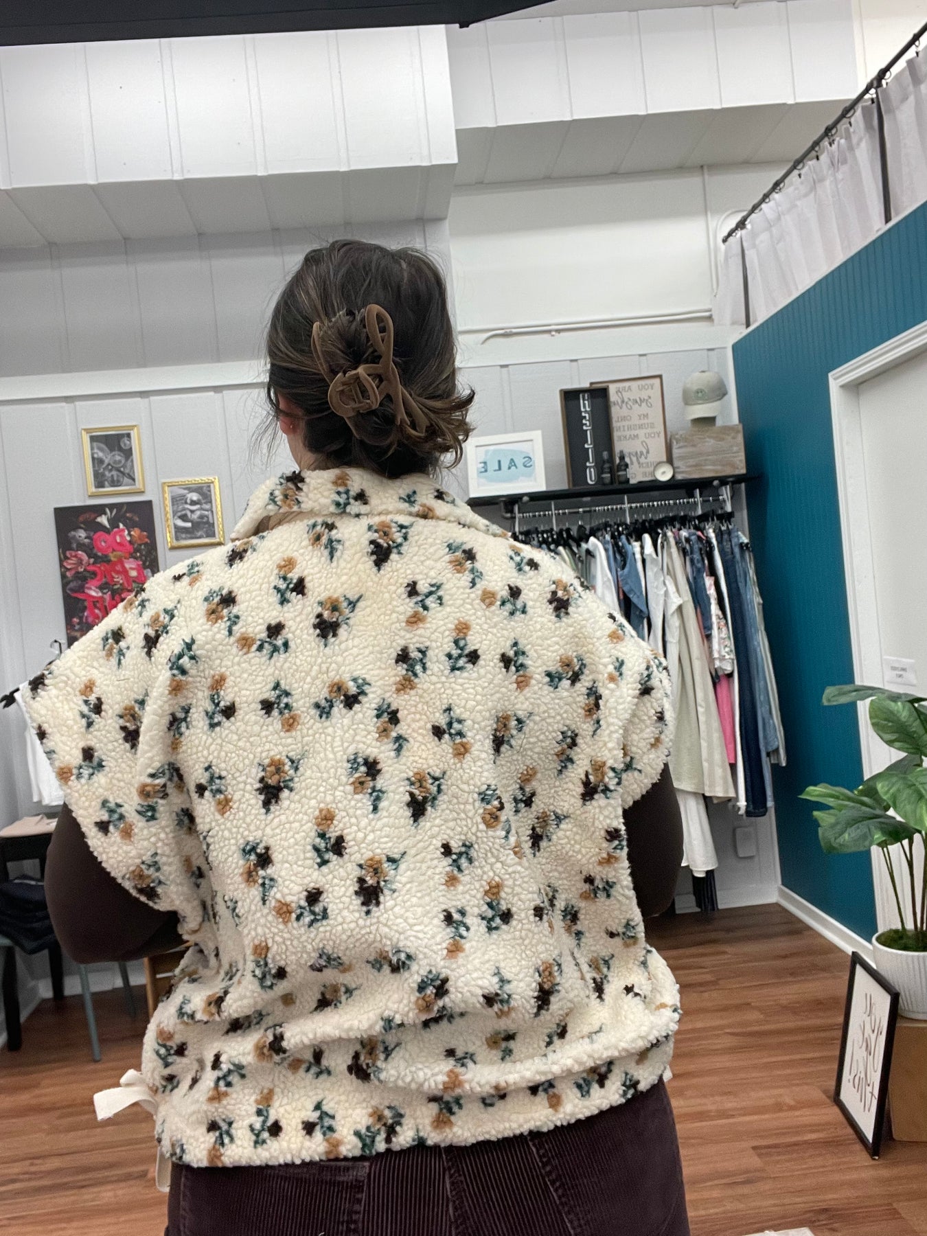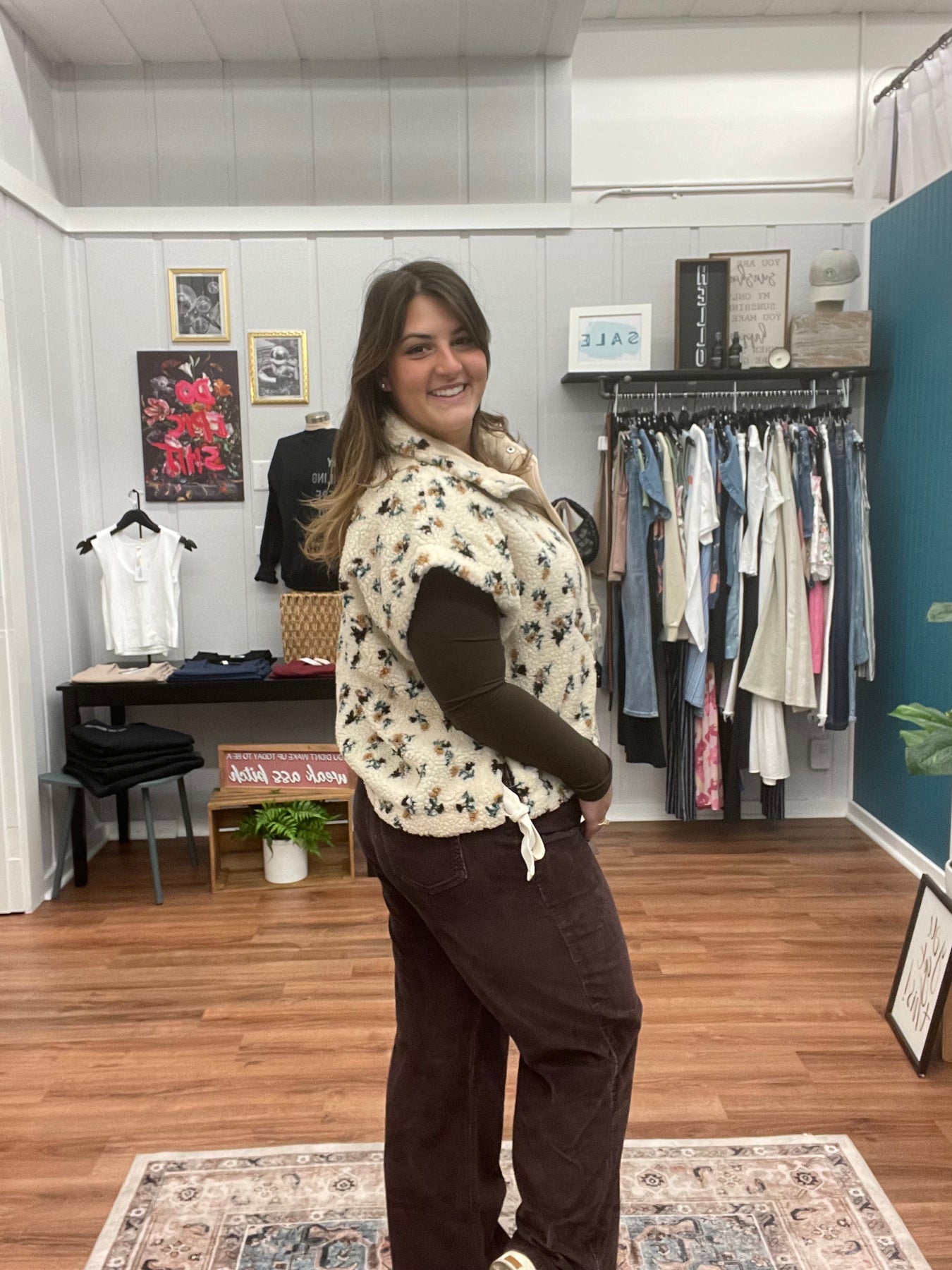Cozy meets cute in this floral oversized soft Sherpa fur sleeveless vest jacket. Perfect for layering, it adds a fluffy, warm hug to any outfit while turning heads with its charming floral pattern. Easy to throw on and perfect for cool days, it invites you to stay snug while showing off your playful style.