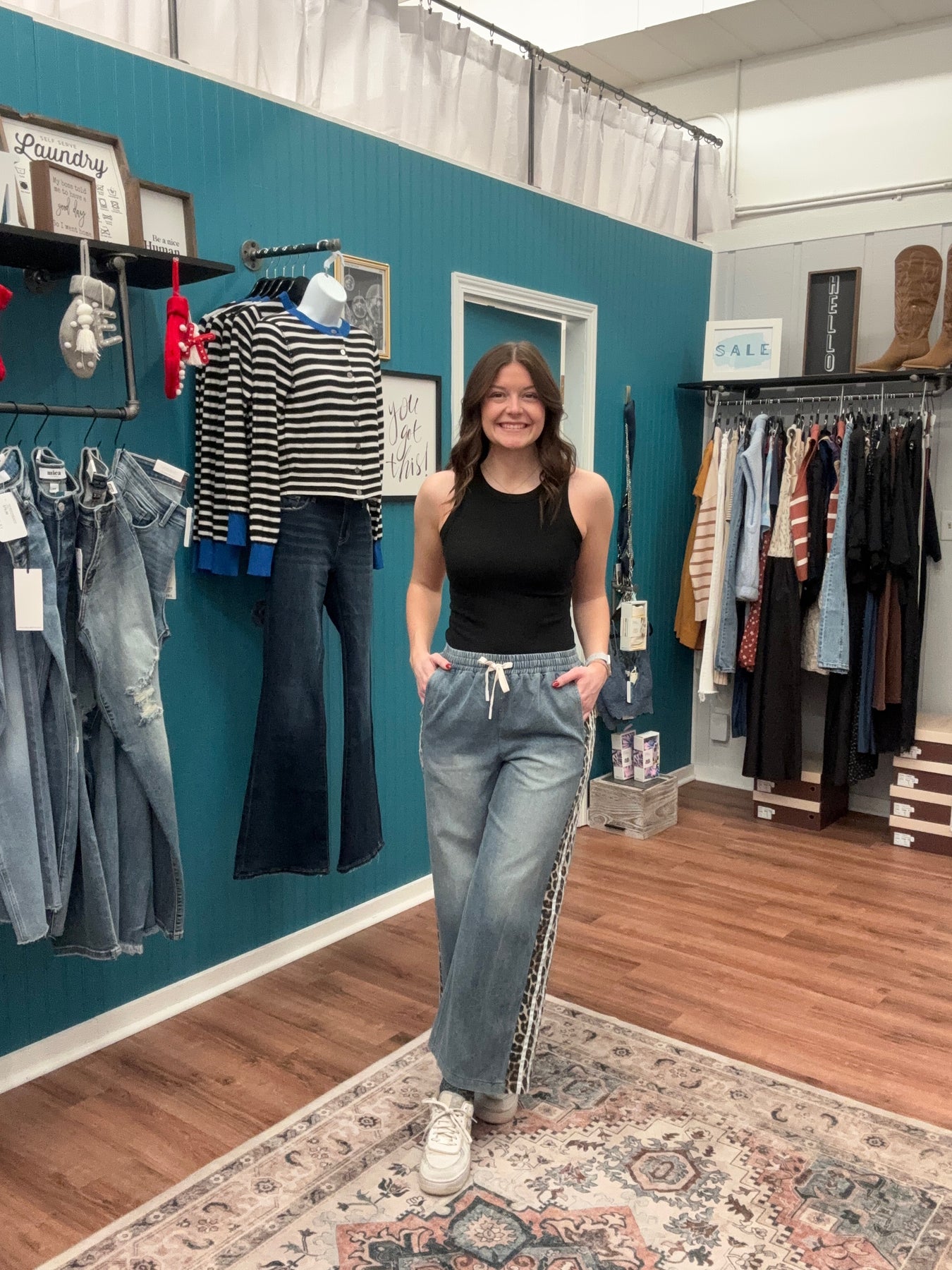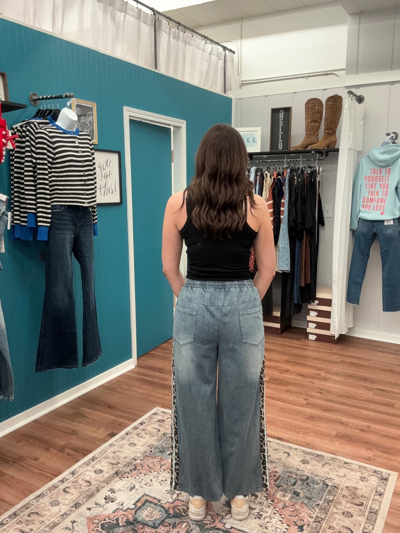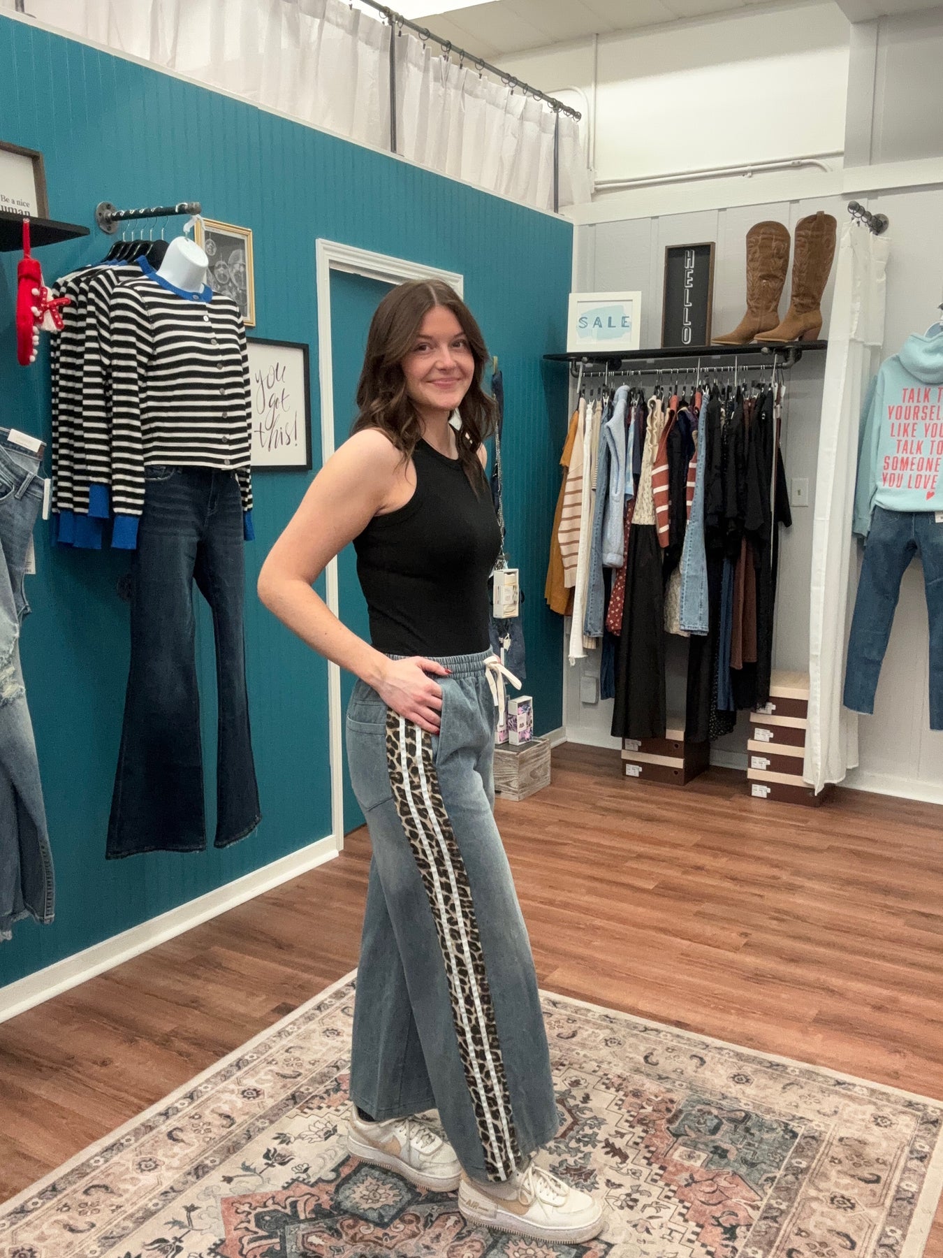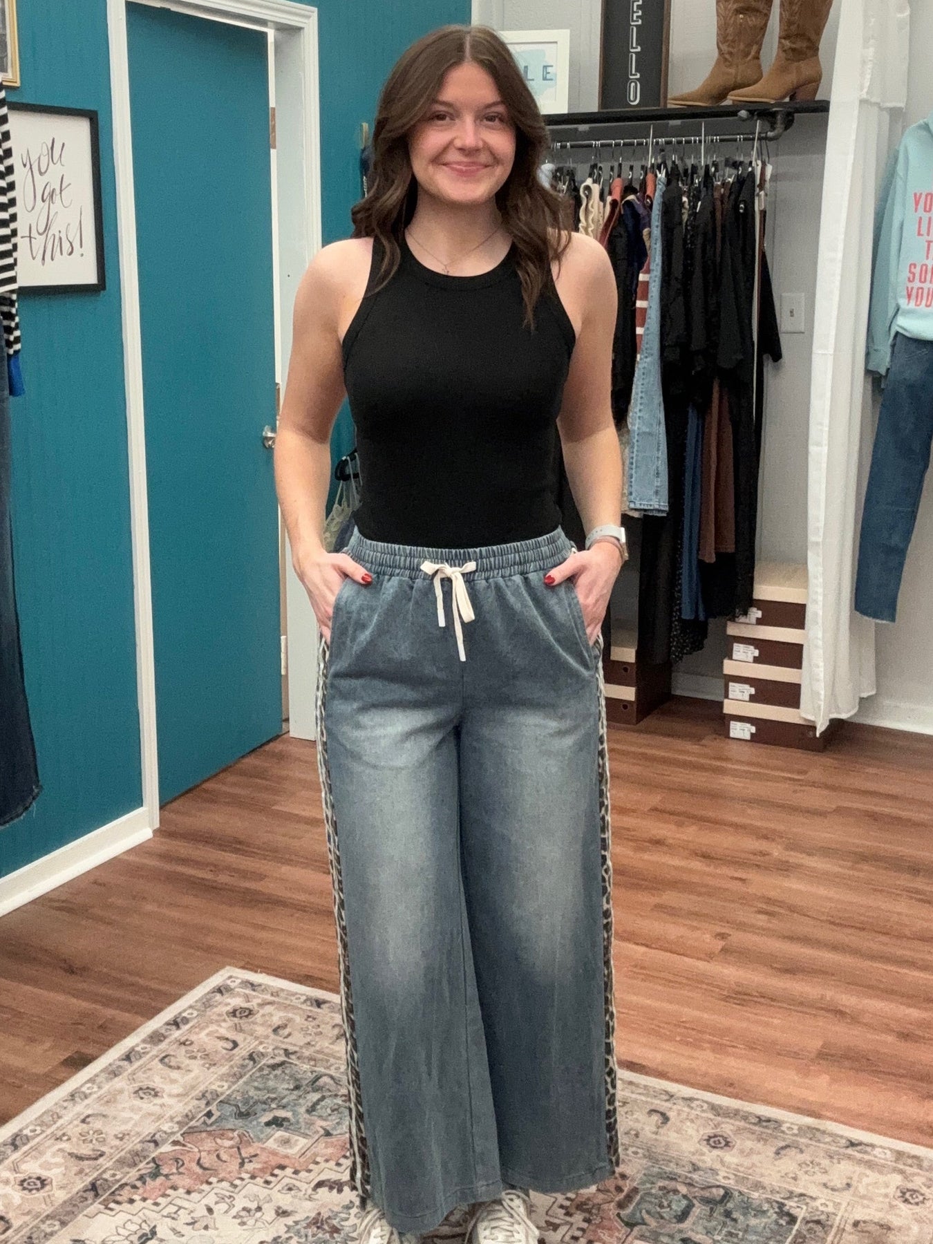 These wide-leg denim pants combine relaxed comfort with contemporary design elements. The drawstring waist allows for adjustable fit, accommodating different body types and styling preferences. A distinctive leopard print contrast panel runs along each side, creating visual dimension and modern appeal. Practical side pockets enhance functionality while maintaining the streamlined silhouette. Crafted for everyday wear, these pants work equally well dressed down with sneakers or elevated with accessories for a polished casual look.