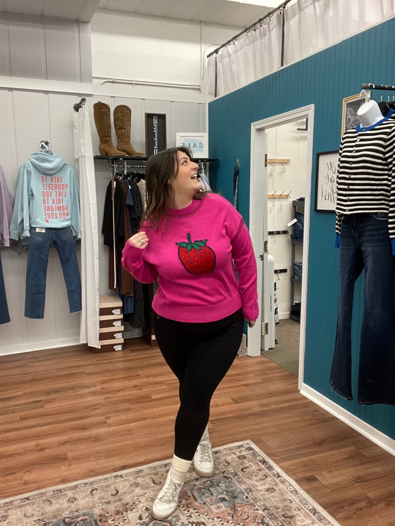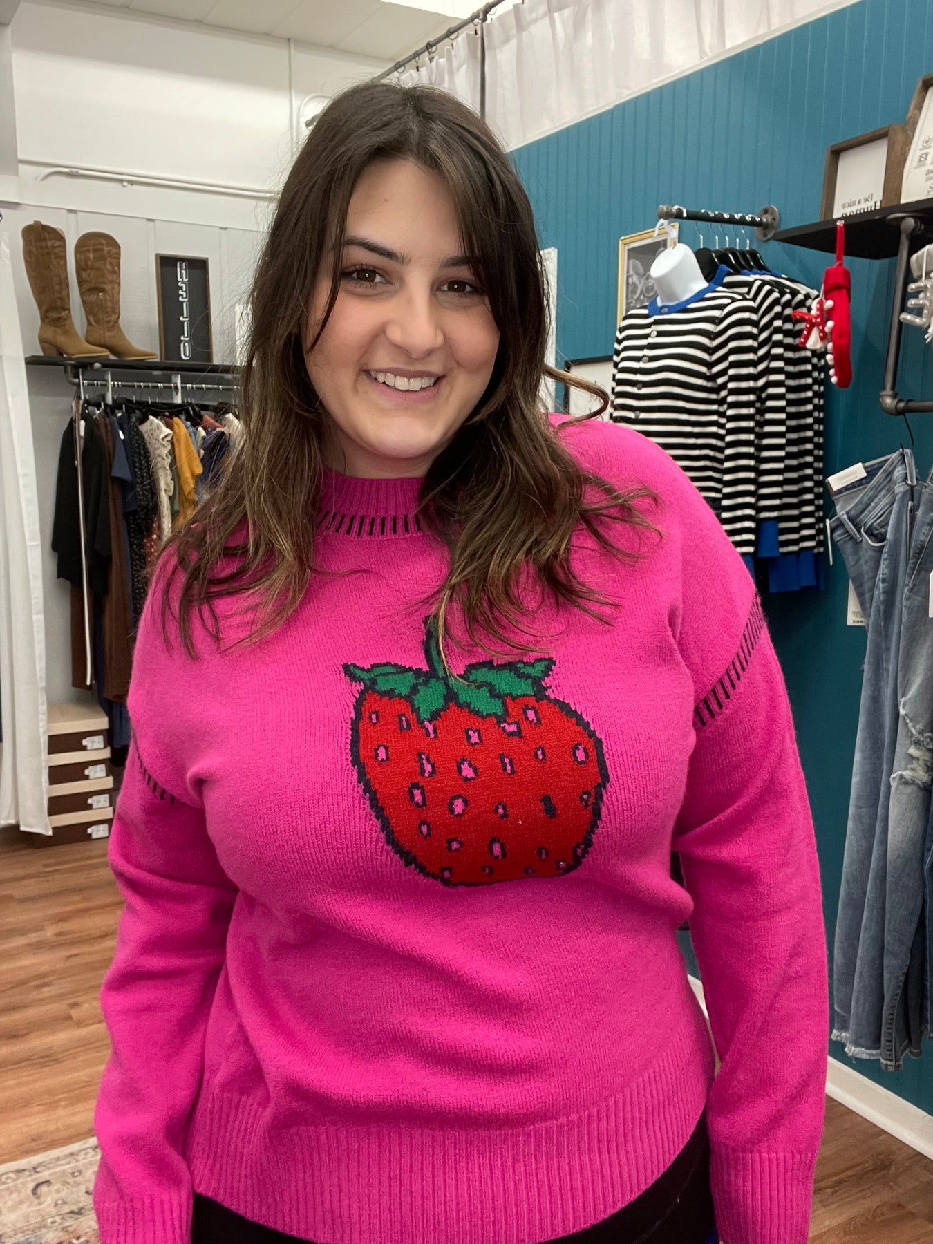 Wrap yourself in cozy sweetness with our Strawberry Crewneck Sweater! This playful long-sleeve top features a charming strawberry design that brings a pop of fruity fun to your everyday wardrobe. Crafted from soft, comfortable fabric, it's perfect for lounging, casual outings, or layering through the seasons. The relaxed fit ensures all-day comfort without sacrificing style. Whether you're a fruit lover or just adore quirky, whimsical pieces, this sweater is sure to become a go-to favorite that makes you smile every time you slip it on.