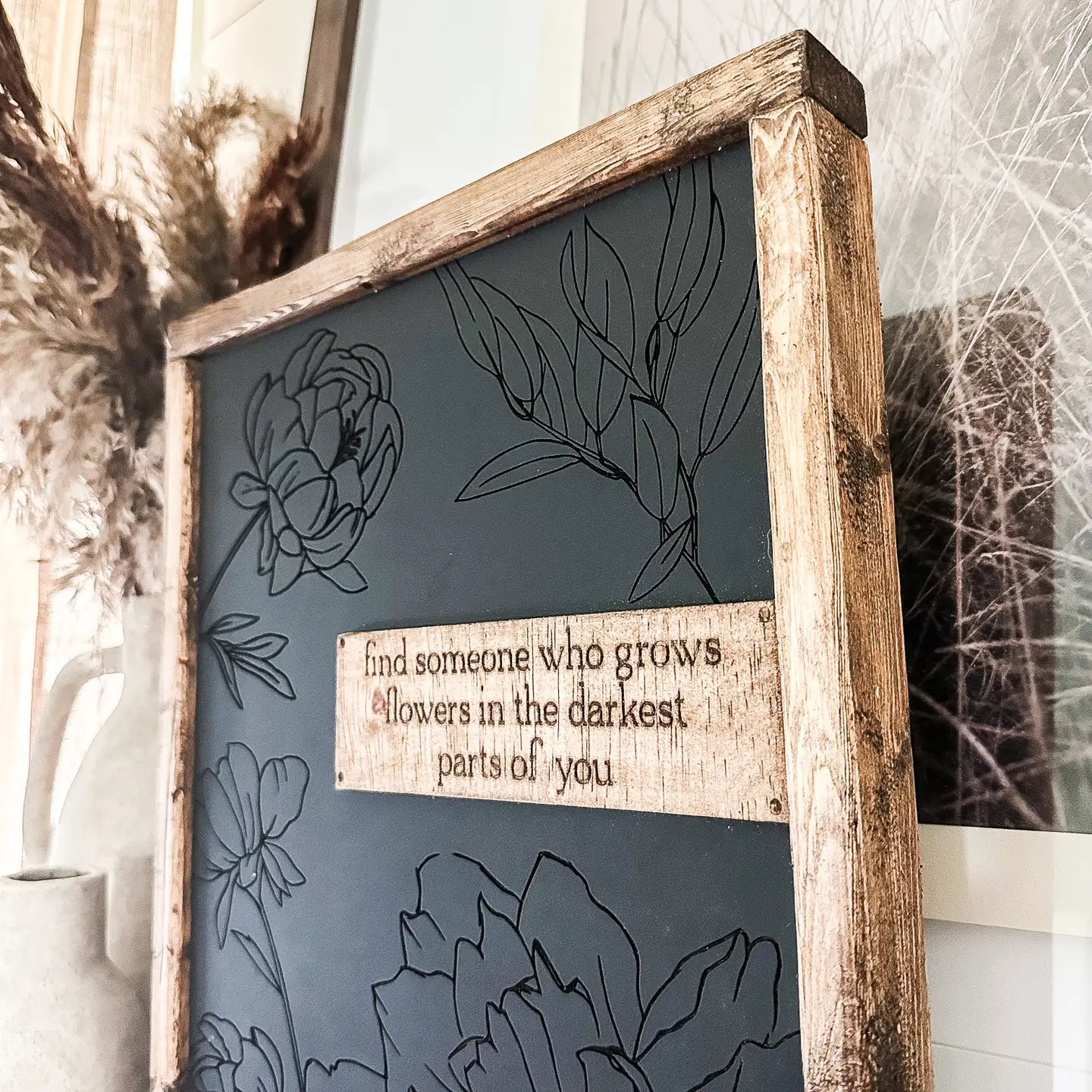 Find Someone Who Grows Flowers in the Darkest Part Wall Sign This charming 15" x 12" wooden wall sign brings warmth and wisdom to any room. Crafted from rich special walnut, it features beautifully engraved floral lettering that catches the light just right. Perfect for plant lovers, gardeners, or anyone who appreciates a little botanical inspiration, this piece celebrates resilience and beauty in unexpected places. Hang it in your bedroom, living room, or garden nook for a daily dose of encouragement and natural elegance.