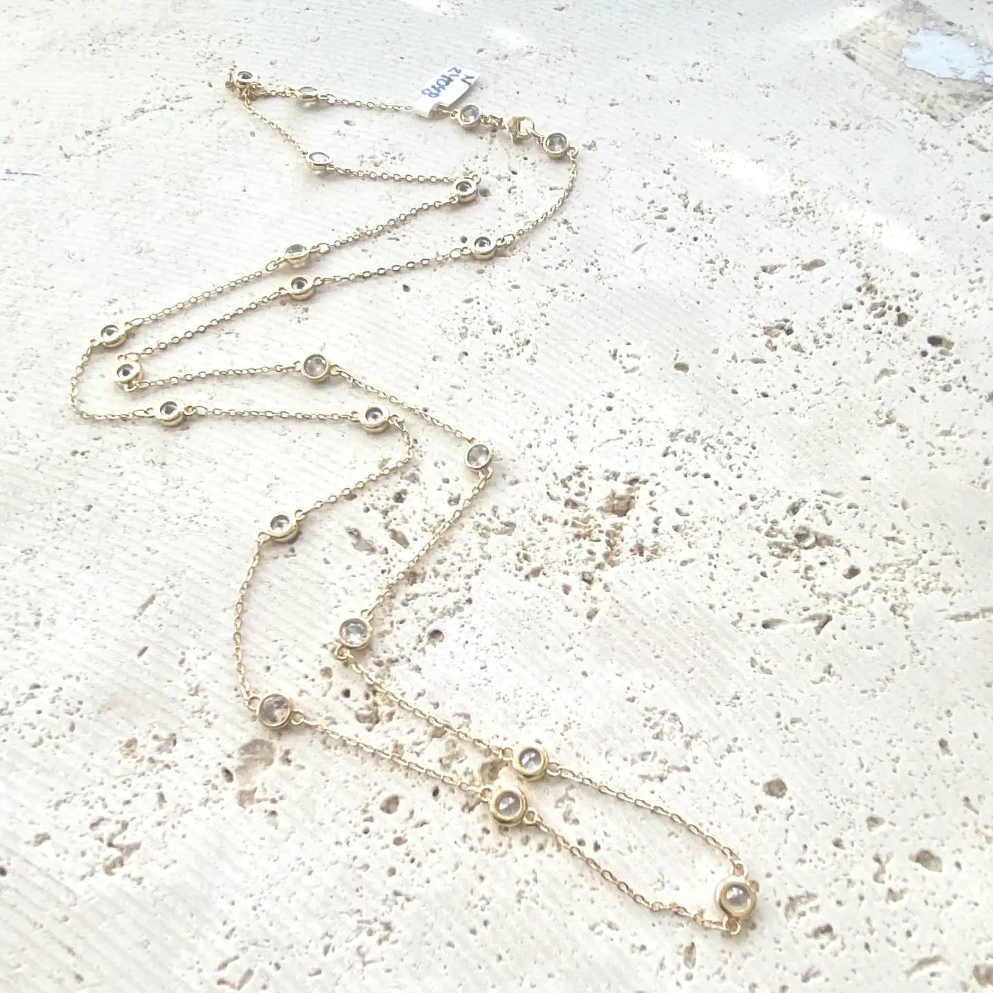 This versatile five way circle cz necklace can be worn long, doubled, or as a lariat, offering multiple styling options. With a length of 34", it can be adjusted to fit your preference. The perfect accessory for all your travels.