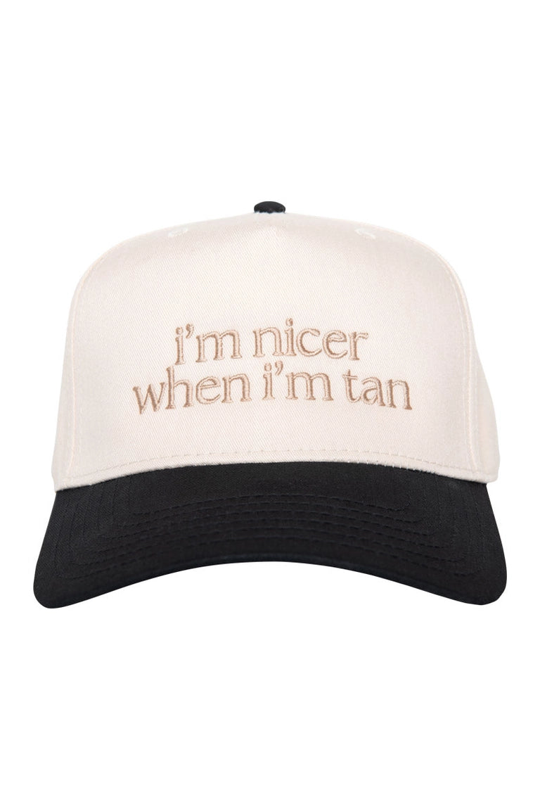 I’m Nicer When I’m Tan Two-Toned Vintage Hat! This fun hat features a tan crown with a colorful brim and the embroidered slogan “I’m Nicer When I’m Tan” on the front, making it the perfect accessory to show off your playful side.