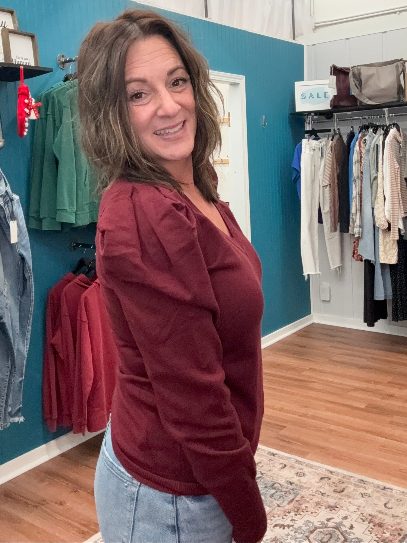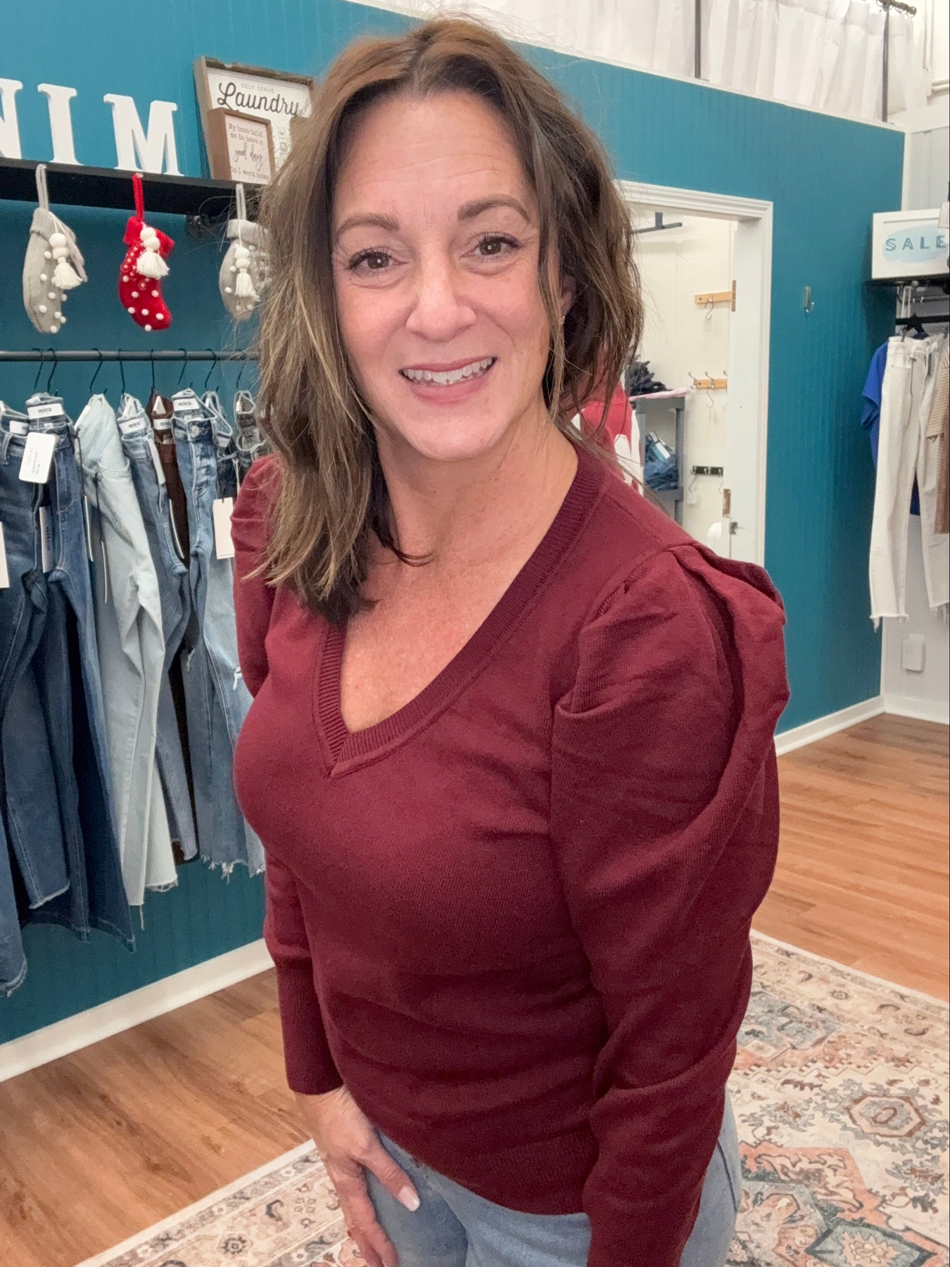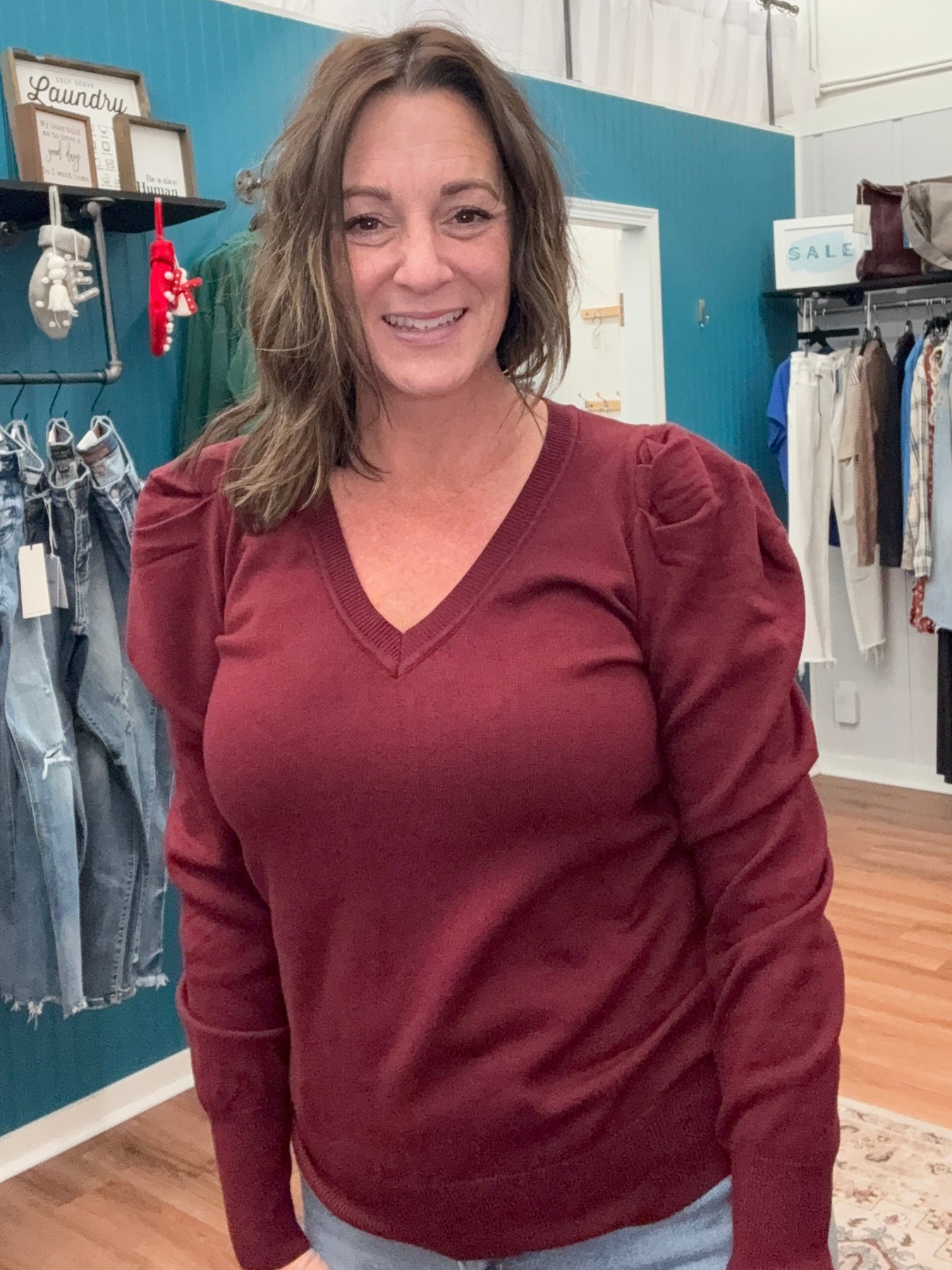 Elevate your layering game with this sophisticated V-neck puff sleeve sweater. The voluminous long sleeves add contemporary flair while the classic V-neckline creates a flattering silhouette. Crafted for versatility, this piece transitions seamlessly from casual weekends to polished office settings. The structured puff detailing at the shoulders provides visual interest without compromising comfort. Perfect for layering over basics or wearing solo, this sweater delivers both style and substance for the discerning wardrobe.