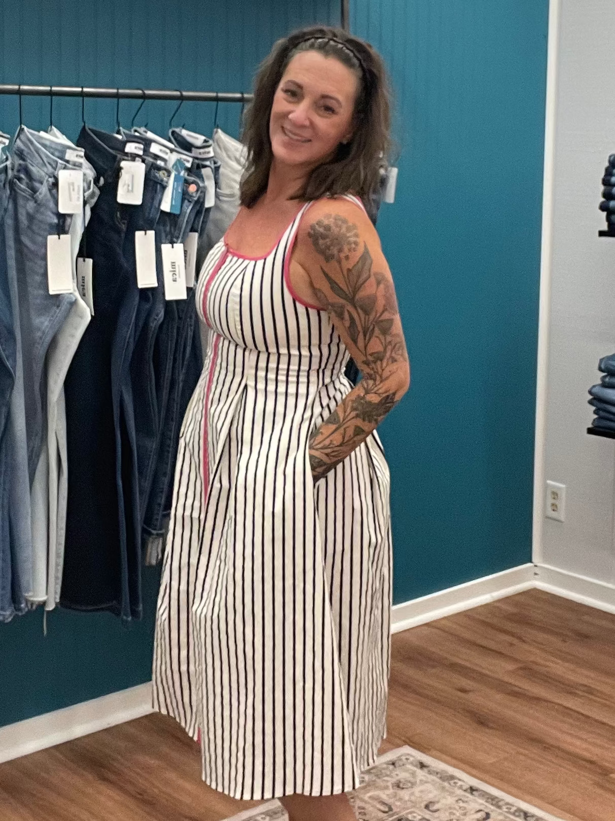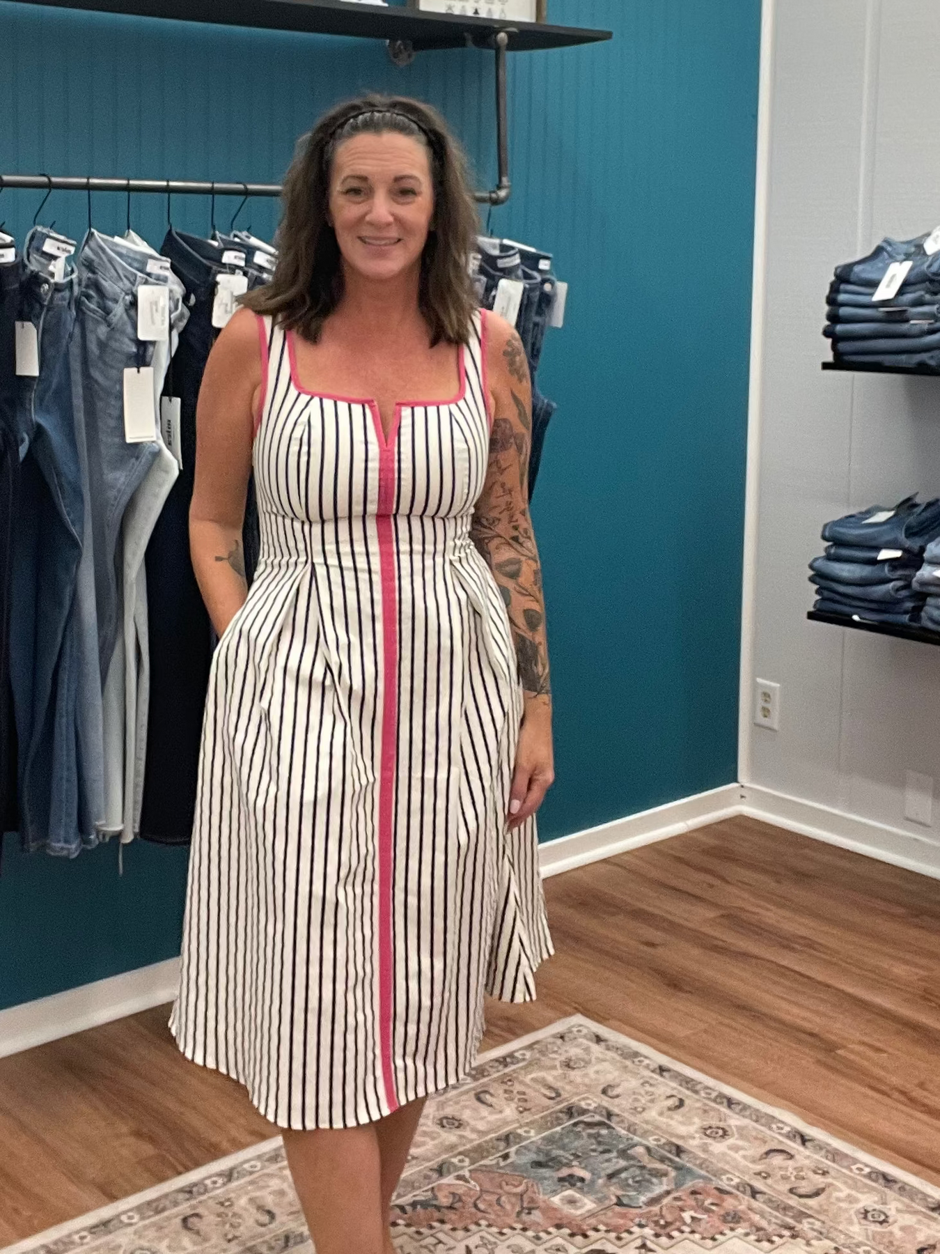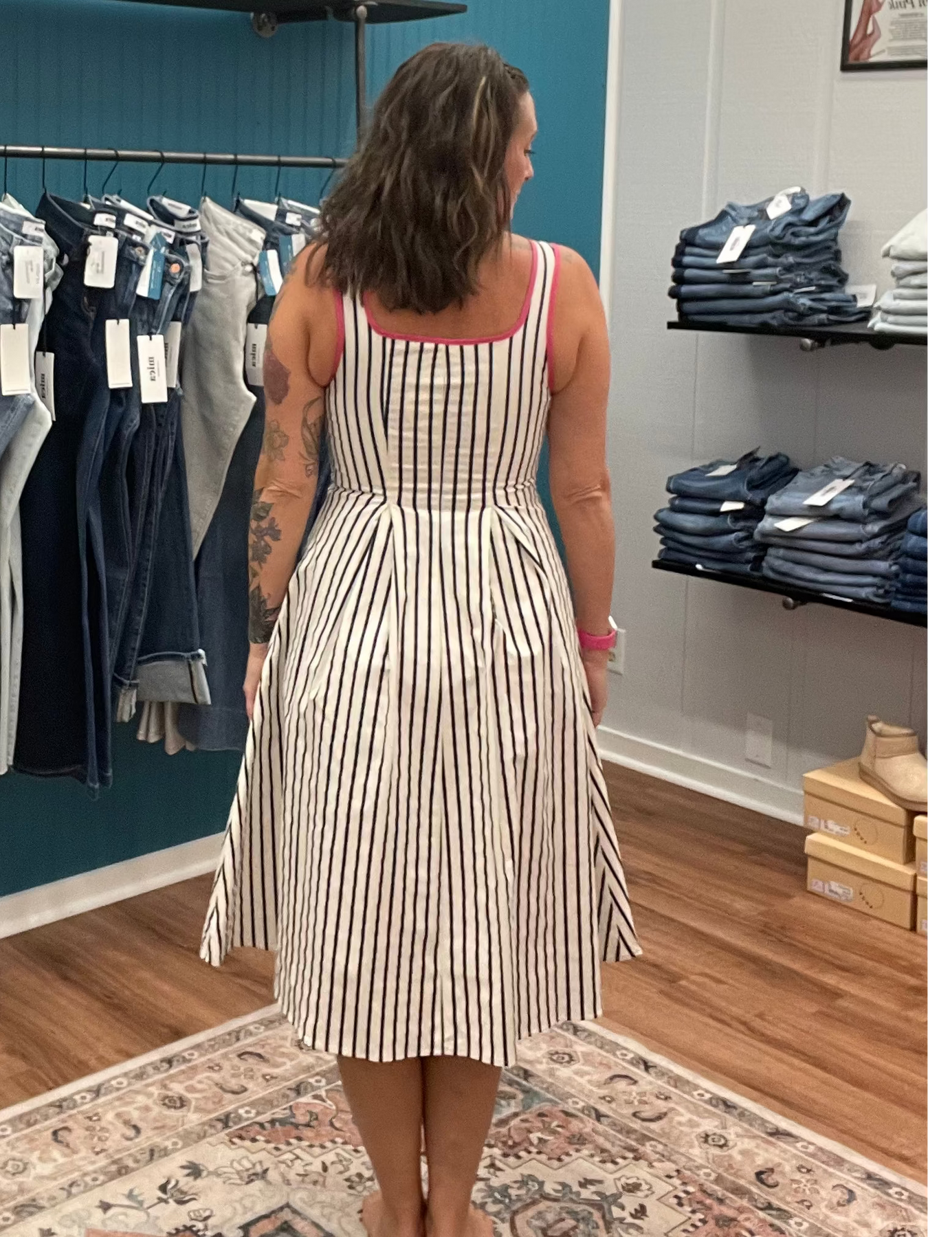 This preppy striped midi dress combines timeless style with modern comfort. The flattering fit-and-flare silhouette is anchored by a pleated waist and supported by a structured V-wire neckline, while contrast pink binding adds a polished finishing touch. Crafted from soft, stretchy cotton-spandex, the fabric moves with you for all-day wearability. Practical side pockets and a chic stripe pattern complete this versatile piece—perfect for everything from casual outings to elevated occasions.