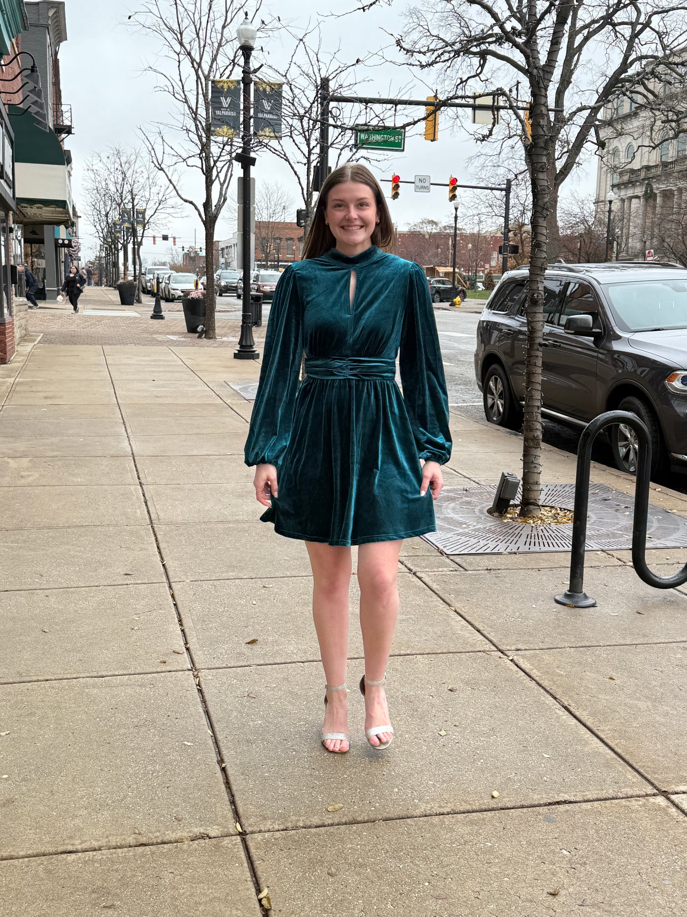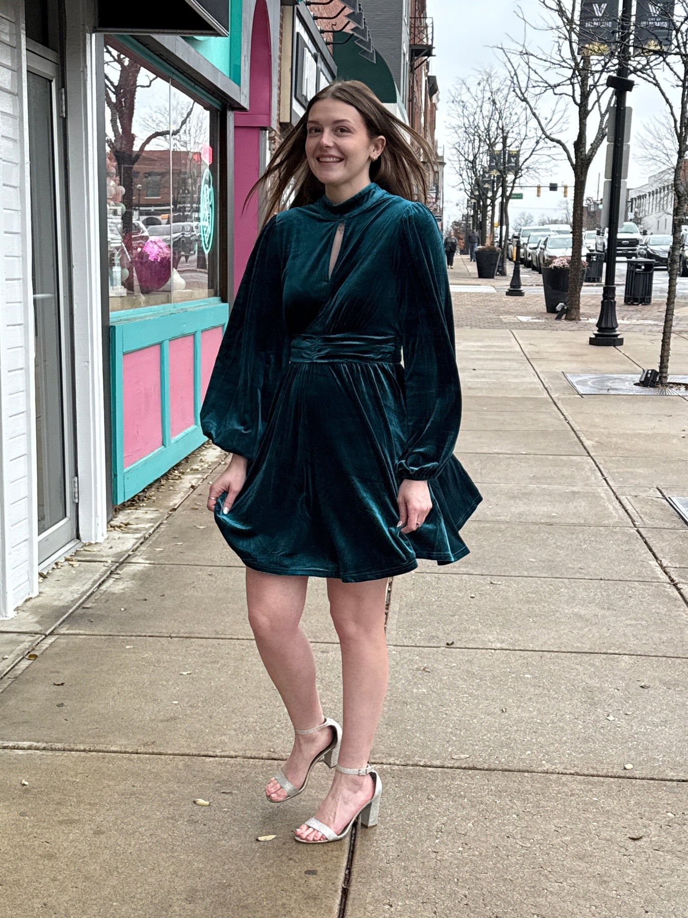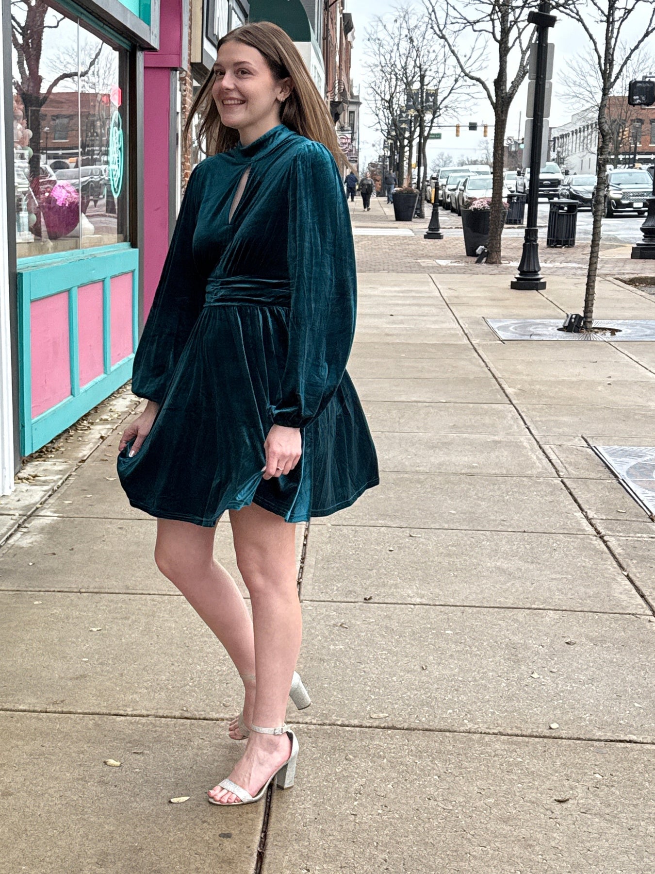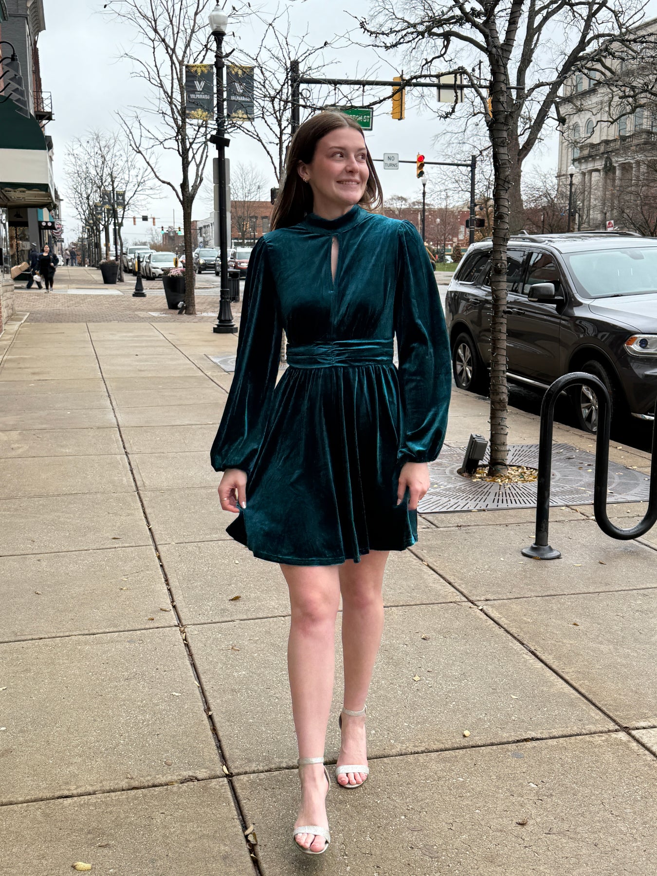 This velvet mini dress combines refined sophistication with romantic allure. Crafted from sumptuous velvet, it features statement puff sleeves that frame the shoulders with graceful volume, while an elegant front keyhole detail adds intrigue and dimension. The mini length showcases the legs while maintaining an air of refined elegance—ideal for evening events, upscale dinners, or special occasions. The structured velvet fabric ensures a polished appearance that photographs beautifully and feels luxurious against the skin. A versatile investment piece that transitions effortlessly across seasons and occasions, delivering timeless appeal with contemporary styling.