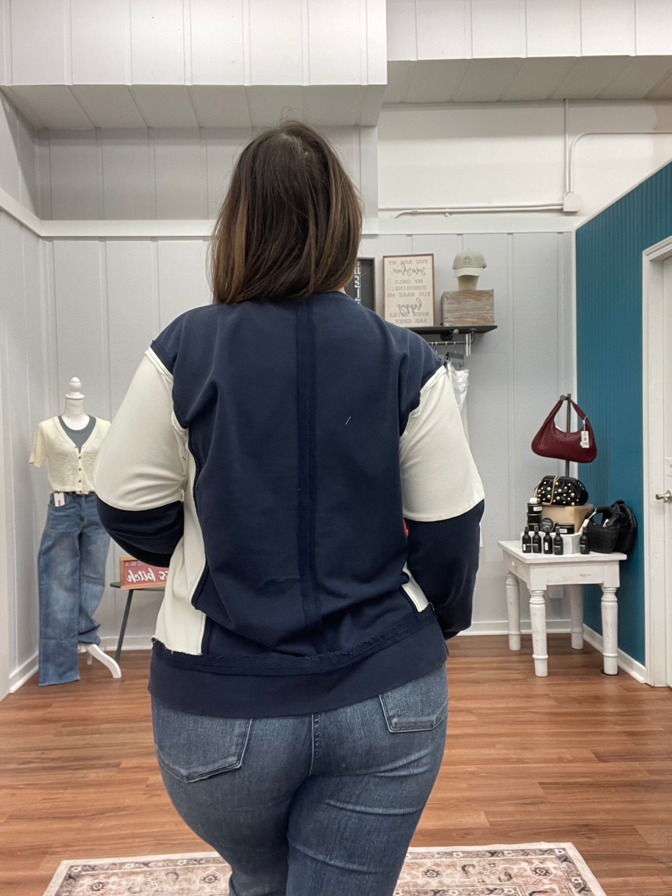 Get game day ready with this playful long-sleeve color block top featuring a trendy raw cut detail. The v-notched neck adds a flirty touch, while the slit hem gives you extra movement and style. Perfect for cheering on your team in comfort and flair!