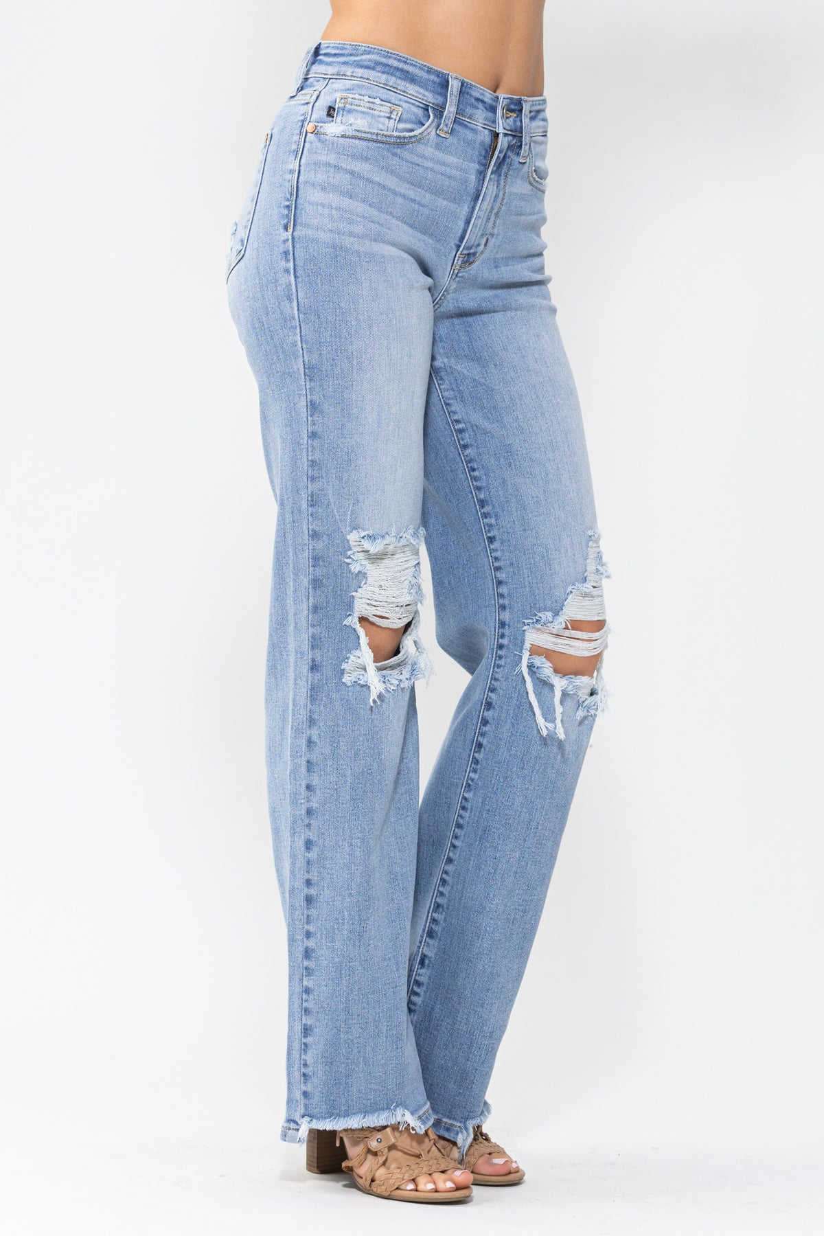 High Waist knee destroyed 90's straight leg denim that has the perfect amount of stretch and playfulness to make a unique and fun outfit!