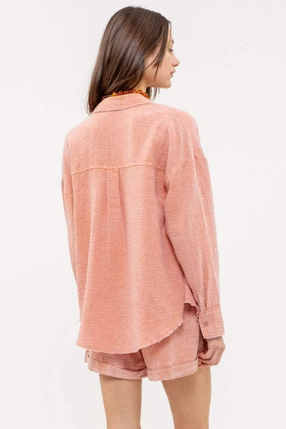 Collared button down with long sleeves and button cuff.  Raw edge hem for a fun look. Gauze material for complete comfort!